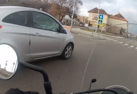 A második videó egy sokkal neccesebb helyzetet mutat be: a Nagytétényi úton egy motoros szabályosan behajtott a körforgalomba, a mögötte érkező autó azonban rettentően sietett. A körforgalmon belül megelőzte a motorost, majd lendületesen kivágódott a kijáraton. Nem volt messze tőle, hogy elsodorja.