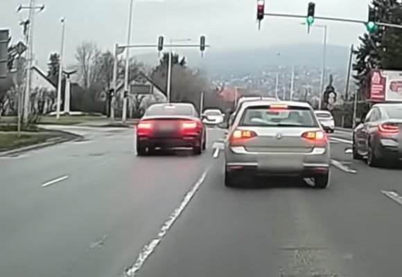 A negyedik felvétel Szentendrén készült, és maximálisan kiakasztja a tahósági mutatót. Egy Audi sofőrje úgy döntött, hogy nem hajlandó várni, mint a többiek: balról (!) kikerülte a kanyarodósávban várakozókat, áthajtott a piroson, bevágott a szemből érkező autók elé, majd balra távozott, mint aki jól végezte dolgát. Van bőr az arcán, az fix.
