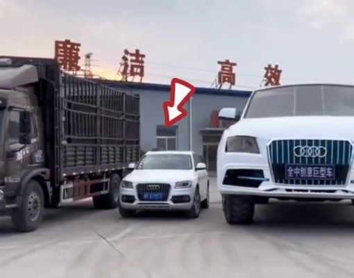A tereptárgynak sem utolsó autón látszik, hogy egy Audi hobbiterepjárót imitál, azt már nem olyan könnyű megmondani, hogy melyiket. Szerencsére mankónak mellékeltek egy eredeti, apró Audi Q5-öt, illetve az őrült kreálmányra Q500-ként hivatkoznak, így penge logikával kikövetkeztethető, hogy egy felnagyított Q5 megalkotása lehetett a cél.