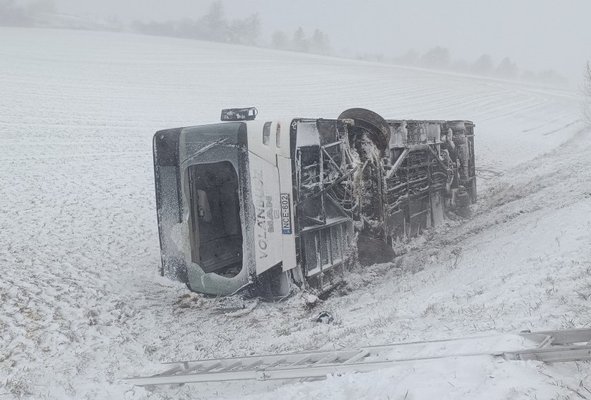Borítókép: A havazás miatt árokba borult busz a 76-os főúton. - Forrás: MÁV.