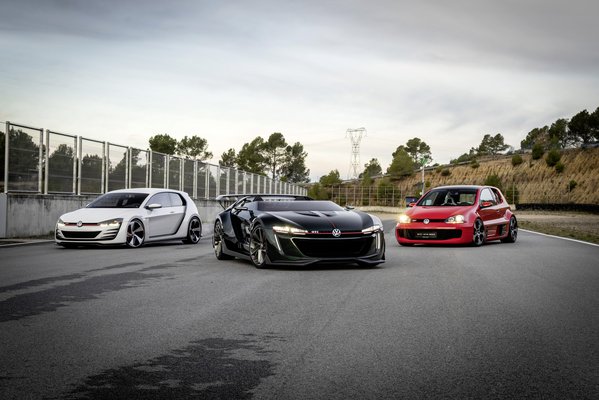 A Volkswagen elővett a nagy, céges fészerből két másik, fantasztikus koncepció-Golfot is. Előkerült a teljesen elmebeteg, hátsókerekes szörny, vagyis a hatliteres, kétturbós, 650 lóerős Golf GTI W12-650. Utóbbi szinte biztosan a legmeredekebb gyári Golf, ami valaha készült. Megjáratták a csodálatos külsejű, Golf Design Vision GTI-t is, amiben a Roadsteréhez nagyon hasonló technika dolgozik. Eszméletlen menő ez a három koncepcióautó így együtt.