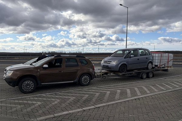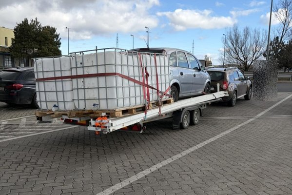 A szerelvény elején egy, szabad szemmel is jól láthatóan leterhelt Dacia Duster látható, mögé pedig egy kéttengelyes trélerre egy Opel Merivát, valamint négy IBC-tartályt pakoltak fel.
