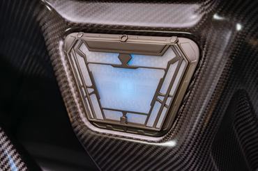 Az utastér abszolút passzol az autó külső megoldásaihoz, hiszen hasonló színekkel dolgoztak, illetve rengeteg a karbon. Még a két kagylóülés váza is a könnyű de erős anyagból készült, illetve több helyen itt is megjelenik a 24 karátos arany. Emellett izgalmas részlet, hogy a két ülés között megjelenik egy kéken világító elem, ami Vasember – az utolsó filmekben látható – ARC reaktorát imitálja.