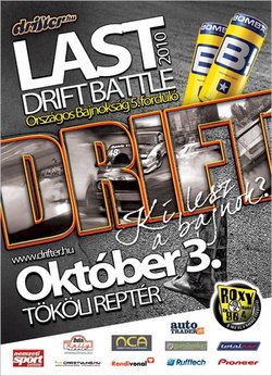 A tököli aszfalt idén zsongott a Drift rendezvényektől, mégsem merném kijelenteni, hogy aki mindegyiken részt vett, annak nem fognak ismételten újat mutatni Magyarország legjobb és legelszántabb keresztben közlekedő autóversenyzői. Az utolsó versenyre talán az is összekalapálja a szigetelő szalaggal foltozott vasat, aki eddig csak ült a kupac fém mellett és sóvárogva várta a jó tündért, hátha kívánhat valamit. Mindez legyen a múlté, a 2010-es évben ez az utolsó lehetőség, hogy az állát a földről vakargató publikumnak profi keretek között mindenki megmutathassa, mekkora istencsászár a volán mögött. Tehát kedves pilóták, nyúljatok a pillanatragasztós flaska felé, Ti, kedves közönség pedig rettegve várjátok az október 3-át, mert ismételten hajmeresztő lesz a tempó, keresztben!