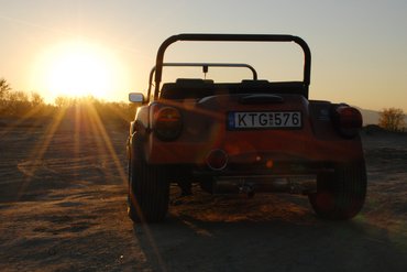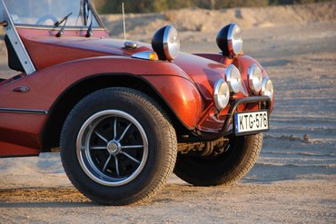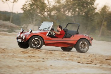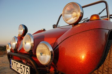 De az élmény, az élmény! Nem vagyok olyan kövér, mint Bud Spencer, korántsem vagyok annyira atletikus, mint Terence Hill, és mindkettőjüknél sokkal kevesebb a hajam. Ráadásul a Szentendrét Pomázzal összekötő, lepukkadt út 2007 októberében közel sem adja ki az 1974-es, olasz külvárosi vurstlik hangulatát. Mégis, tényleg jön a film feelingje. Mindenki vigyorog az autóra, máris egy jó pont. A szélvédő messze van, a kerete bazi magas, teljesen más a hangulat, mint akármilyen kabrióban. Oldalfal pedig nincs, utoljára egy 1927-es Fordson traktor nyergében éreztem magam így, csak az tizenkettővel ment, ez meg itt százhússzal rotyog (bíróság előtt letagadom). És masszívan ott van az úton, valódi autózás ez. Aki buggyt vezet, annak nem pótvigyor van az arcán.