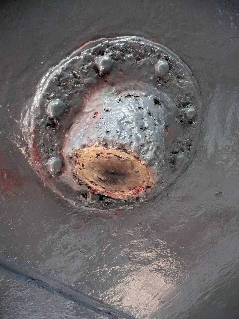 Megnézem a szonár kivezetését, hát tényleg, aki ezt fadugónak nézi... Mindegy, közben kennek rá hígítót és levakarják a nagyját.