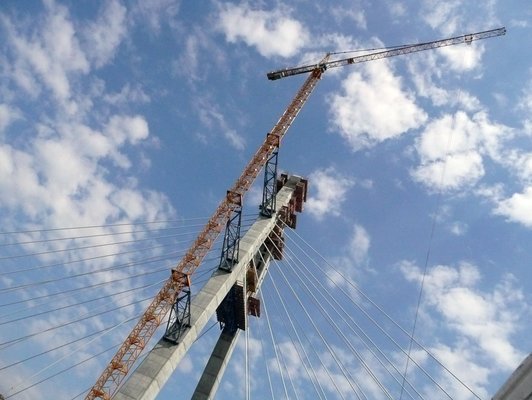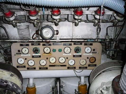 Közben az épített vaslépcsőn felmegyek a Sólyom III tatjára, a hátsó fedélzeten át eljutok a gépházhoz, ami a holland gyökereknek megfelelő "Machinekamer geen toegang_" táblát visel, odabent viszont minden maradt orosz. A gépterem egyszerűen lélegzetelállító. Aki szereti a Das Boot hangulatát, tudja, mire gondolok. Kevés a hely, de azért nem nyomasztóam szűkös, viszonylag kényelmesen elfér egy csomó műszer, kezelőszerv, és persze a két V12-es turbódízel. Hiába hajt szárnyashajót és várnánk nagy pörgést, már 1600-as fordulatszám körül leadja a csúcsteljesítményt, aminél nem sokkal kevesebbel utazik a Sólyom. A V12 turbódízel és az 1000 lóerő is stimmelne, szívesen rámondanám, vagy legalábbis városi legendaként terjeszteném, hogy ez a T72-es tank 62 liter hengerűrtartalmú motorja, ami valószínű, de egyértelmű bizonyíték nincs. Ezt hivatalosan Zvezda M401-nek hívják, a T72-es szakirodalma viszont emleget V-84-et, V-92-t, meg hasonlókat. De hát ugye miért is ne? Tárolóuszályunkat rögzítik a Colbert híd melletti rozsdás vízivilághoz, hihetetlen a híd közelről. Egy szép műtárgy. Mellette meg egyenesen hátborzongatók a toronydaruk, három ponton a betonívekhez rögzítve. Mennyiért is kapaszkodnék fel szélben?