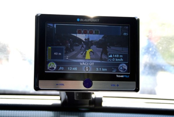 Az apropó, amiért a TravelPilotot ki akartam próbálni, a Blaupunkt által kifejlesztett videó navigációs mód. A dolog lényege, hogy nem a szoftver jeleníti meg a térképet, hanem a készülékbe beépített nagylátószögű kamera képét látjuk, és a navigációs szoftver erre a képre rajzolja fel a menetirány tartásához szükséges jeleket, egyéb információt.