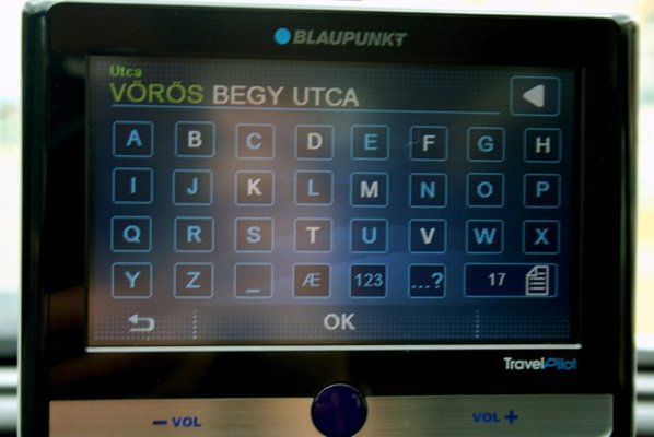 A navigáció alapja a gépen flashben (8 giga, hűha!) tárolt Teleatlas térkép adatbázis, a tesztkészüléken a 2008-as második verziószámú változata. Nem tetszett, hogy bonyolult a címbevitel, rengeteg almenün keresztül adható meg a cél, ez körülményessé teszi a bepötyögést. A virtuális billentyűzeten nincsenek ékezetes karakterek, külön kell belépni egy olyan képernyőre, ahol ilyeneket ki lehet választani – európai gyártótól ez érthetetlen tervezési filozófia.