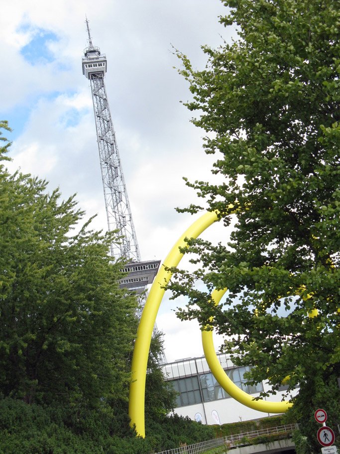 A berlini vásári terület jelképe a hatszáz tonnás rádiótorony (Funkturm), tagadhatatlanul némi Eiffel-beütéssel, bár nincs fele olyan magas sem. Úgy néz ki, mintha a párizsi torony süllyedt volna úgy 170 métert. Nem mondom, pár hektoliter Berliner sör után akár Párizsban érezheti magát az ember, ha már nem lát el a környezetében lévő birodalmi stílusú régi épületekig és a modern új csarnokokig.