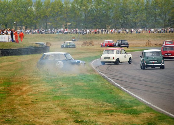 Egy órával később pedig jött a Mini-futam, azaz a St. Mary's Trophy, amelyen kivétel nélkül 1966 előtti, 1275-ös Cooperek indultak, összesen harminc darab. Bár egy Mini talán nem túl érdekes, amikor az ember előtte Lotus-Climax és BRM versenyautókat, utána pedig Ferrari GTO-kat és short-nose Jaguarokat lát dühből nyomulni, de harminc Mini küzdelménél kevés izgalmasabb dolog létezik, még Goodwoodban is. Volt, hogy négy autó hajszálpontosan azonos szögben sodródott a kanyar előtt, a kifékezések, kilökések teljesen általánosak voltak, egy csomó autó sérülten fejezte be a versenyt. Dörzsölték is a tenyerüket a díszléc-utángyártók...