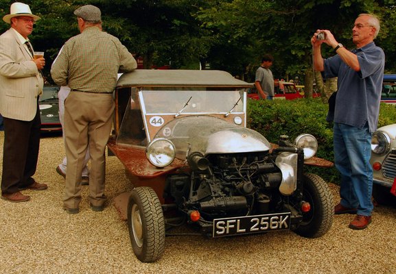 Aztán láttunk Dartot is, az áramvonalas Minit, amelyet egy Dizzy Addicott nevű ember épített 1963-ban egy rommá tört, öt fontért megvett Mini Travellerre (azaz kombira). Szépnek nem szép, de egyedi, és van benne olajhűtő is, látszik, mert maszk az nincs.