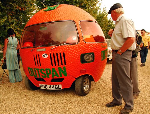 Meg persze az Outspan-Mini is felbukkant. Ez a narancshoz hasonlító gömb is Mini-alapú, de a padlólemezt megrövidítették. Hajtását egy automata váltós Miniből vett egység végzi, aljában tőkesúly van, nehogy felboruljon. A konkrét példány a beaulieu-i (bjúlíi) közlekedési múzeumból származik. A kocsi természetesen promóeszköz volt fénykorában, 1972-ben készült.