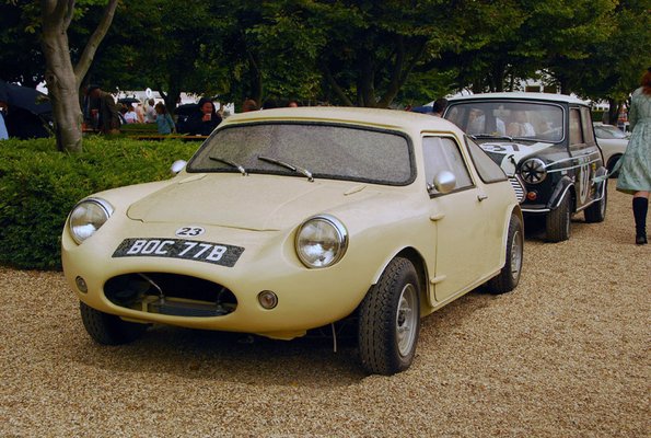 Aztán ott volt az 1963-as Cox. Fogtak egy Mini első és hátsó segédvázat, benne a komplett mechanikával, tuningoltak rajta kicsit, majd egy saját gyártású acélvázba beépítették. A karosszéria persze műanyag – ha innen nézzük, kicsit Corvette, ha onnan, akár Trabant is lehetne, persze csak az anyag miatt, mert különben zsír.