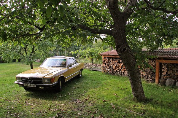 A másik bevésődés tizenöt évvel későbbről való: egyszer az olasz barátném meglátogatott a holland pasijával, aki egy környezettudatos vízmérnök volt. A tudatosságát odáig fejlesztette, hogy minden hollandus kánonnal szembe menve nem nyírta a gyepet az udvarán, ahol is pár év alatt egy borzasztó gazdzsungel burjánzott el, a pedáns szomszédok legnagyobb bánatára. A zöldséget úgy termelte, hogy a palántákat beleültette a bozótba, így a paradicsomnak is meg kellett küzdenie a túlélésért. Nos, Wout barátom a közlekedésben sem ismert tréfát: egy négyajtós Mercivel járt, ennek az SLC-nek a kortársával, aminek pont ugyanaz, a gyári marketingesek által szaharasárgának elkeresztelt színe volt, mint most az enyémnek. Volt neki egy donorautója is, ami ott rohadt a méteres gazban, ha kellett valami alkatrész, kibányászta belőle, és átszerelte. Daciából átülni egy Mercedesbe szintén igen mellbevágó élmény volt, és az életre szóló pozitív bevésődés a színre is kiterjedt – hát ezért nem menekültem el az egyáltalán nem kupés színt látva. Sőt: nekem ez kifejezetten tetszik, merthogy jó volt Wout nagyon sárga Mercijében ringatózni.