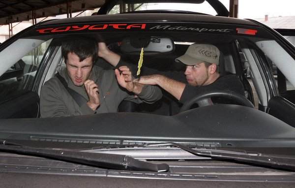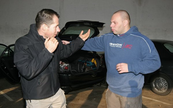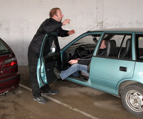 Az autós tréning résztvevőin látszik, hogy többségük nem ma kezdte a Krav-Magázást, ráadásul igen lelkesen csépelik egymást. Szerkesztőségi amazonunk, Angéla elsőrangú kiképzést kap. A személyi edzőjével először csak a betonon gyakorolnak, de fokról fokra közelebb kerülnek az autómhoz. Majd, amikor a tréning tematikájában „az autó, mint fegyver” témakörhöz érünk, az ajtókkal taszigálják egymást, a biztonsági övet rángatják, később egyik a másik fejét veri a műszerfalba, majd cserélnek. Mégiscsak kellett volna cascót kötni.