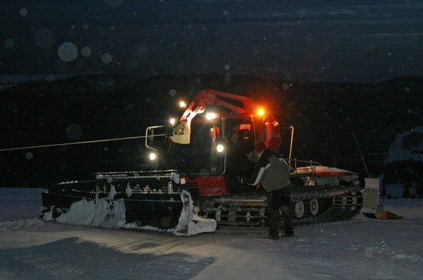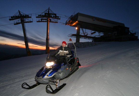 A fülkén körben lámpák vannak, amitől este tényleg ufószerűen néz ki. A felső halogén lámpaegyüttes konkrétan kisüti az ember szemét, tehát ne nézzünk este sokáig szemből, közelről ratrakot. Természetesen sárga színű forgófény is van, de ez sem mentette meg a lányokat, akik pár éve pályazárás után akartak lesiklani, és egy dolgozó ratrak alá csúsztak. Ráadásul a rosszabbik végén. Amíg ugyanis elöl egy minden irányba mozgatható tolólapot találunk, addig hátul rettentő gépezet dolgozik, egy nagy fordulaton járó daráló, amely a letaposott havat-jeget aprítja. Alá kerülni nem szép halál, de legalább gyors – mindenestre azóta nagyon szigorúan veszik a pályazárást. Délután 4-kor vége a sízésnek Donovalyban, utána a karbantartóké a terep. A villanyfényes sípálya fél hatkor újra kinyit, ott este kilencig lehet csúszkálni.