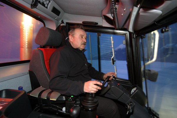 De vissza a PistenBullyhoz: hála az empatikus tervezőknek, a sofőr segge tökéletesen ki van nyalva (politikailag korrekt kifejezéssel: a munkahelye ergonomikus). A jól formázott ülésben állítható a deréktámasz, a kartámasz magassága és hosszúsága is pozícionálható. A fehér számlapos műszerek könnyen leolvashatók, a hatalmas ablakoknak köszönhetően körben jó a kilátás, ami azért erősen függ az aktuális időjárástól. Hogy szegény kezelő ne unatkozzon a hosszú és magányos műszakok alatt, a szélvédő fölé beszereltek egy cd-rádiót is. A legfőbb biztonsági eszköz a masszív fülkén túl a már említett csörlő, aminek a gémje 360 fokban körbefordul, így nem gátolja a manőverezést.
