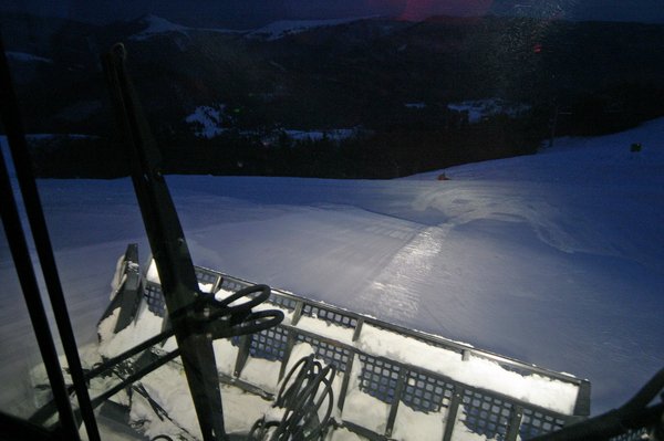 A ratrak föl-alá járkál, közben darál és simít. Ahogy beültünk – én speciel Botond ölébe, merthogy kétszemélyes a fülke, s a bal egyben már ott ült Peter, a rendíthetetlen nyugalmú gépkezelő –, nyomban indultunk is, lefelé a legmeredekebb pályán. Engem a gravitáció ráhúzott a szélvédőre, egyik kezemmel kapaszkodni próbáltam, a másikkal fotózni, de legalább meleg volt bent, úgy harminc fok. Nem kicsit perverz élmény ebből a szaunából figyelni a kinti jégvilágot. Már amennyit látni lehet belőle, mert egyrészt a raktrak felkavarja, a szél meg viszi mindenfelé a havat, plusz itt is teljes gőzzel mennek a hóágyúk.