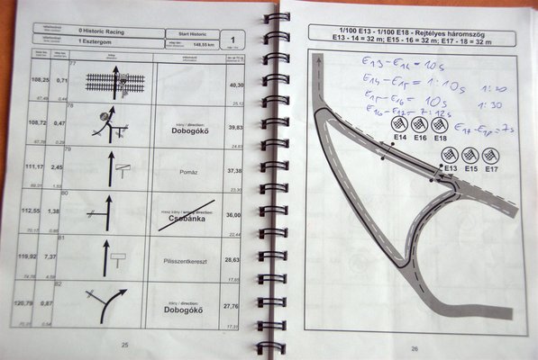 Az első tuti dolog, amit tudtunk, az az idő, amikor indultunk (0:25 perc). Aztán a menetidőlapon perc-másodperc lebontásban meg voltak adva az egyes 1/100-as mérőpontokhoz való érkezési idők (pl. 270:17). Ezekből mintegy 46 volt a nem egész 500 kilométeres távon. Az itiner tartalmazta ugyan az egyes 1/100-as pontok sémáját (mert mint mondottam, javarészt nem egyszerű kapuáthajtásról volt szó), de hogy hány másodperc alatt kell teljesíteni a két cella közötti távot és hogy mikorra kell odaérni, azt már nem. Tessék kiszámolni Mr.Turing, egy kis házi feladat.