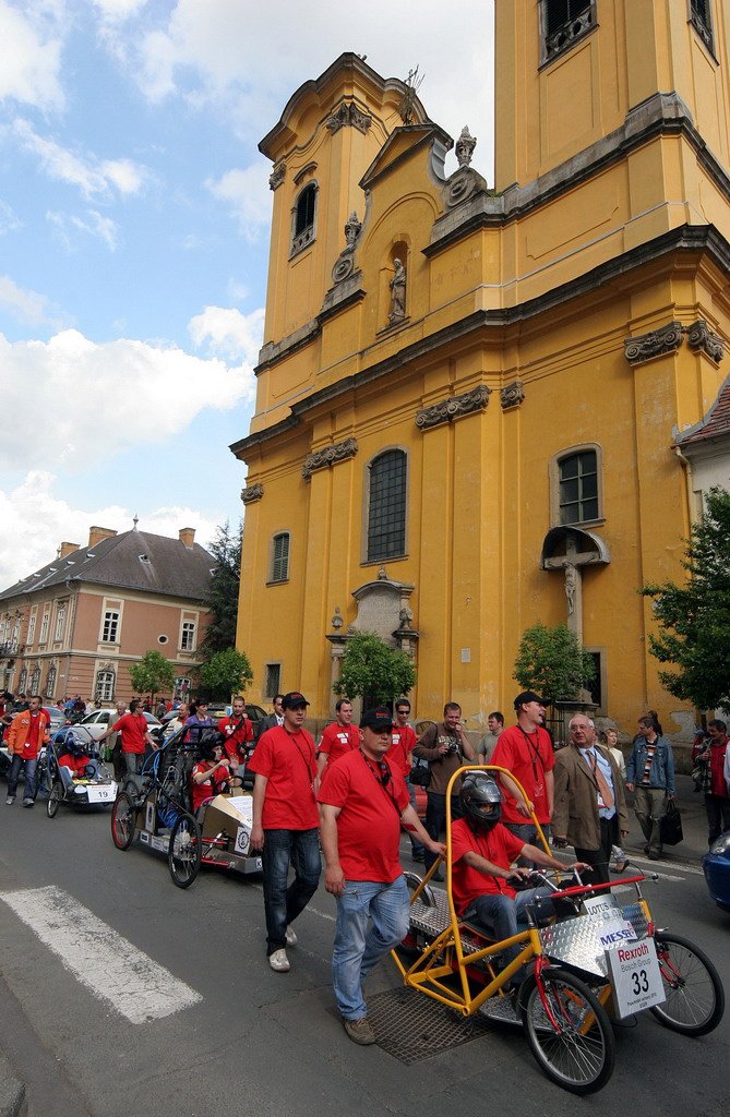 De haladjunk sorjában: az első nap a gépátvételé és a felvonulásé volt. A városi sportcsarnokban berendezett támaszponton bírálta el a szigorú zsűri, megfelelnek-e az előírásoknak a versenygépek. Itt kapták meg a rajtszámokat a rajtengedélyhez jutó csapatok, és innen indultak mazsorettek felvezetésével, katonazenekar muzsikájával a város központjába, a Dobó térre, az ünnepélyes megnyitóra. Én több csapatnak is mondtam, hogy hozzanak nejlonfóliákat, mert északról sötét felhők érkeznek, és az Egerben nagy esőt jelent. Persze nem vettek komolyan. Szerencsére a rendezőknek helyén volt az eszük, úgyhogy gyorsan előkerültek a fóliák, amikor a megnyitó ünnepség utolsó percében lecsapott a zápor. Nejlon ide, nejlon oda, két csapat autóján is elázott az érzékeny vezérlés. Ők nem voltak felhőtlenül boldogok, és az éjszaka jó részét szereléssel töltötték, míg a mezőny kemény magja a közeli diszkóban karaokézott. A totálisan berekedt énekesek le se feküdtek, gyors zuhanyozás után reggel hatkor a madárdalos pályán elkezdték a tesztelést.