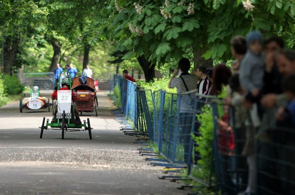 A kép tehát idilli, ám a verseny lassan kinövi a parkot, és lehet, hogy új helyszínt kellene keresni. A toldozott-foldozott aszfalt bringázni, sétálgatni még megfelel, de a pneumobilok egyre gyorsabbak, a pilóták egyre bátrabbak, és a pálya állapota szerintem most már zavarja a versenyzőket. A versenyláz egyébként teljesen hatalmába kerítette a mezőnyt: a gyorsasági futamon két nagy bukás volt a hajtűkanyarban, és több járgány is két kerékre billent ugyanott. Szóval, a fiatalok a határon autóztak, ahogy egy versenyen kell.