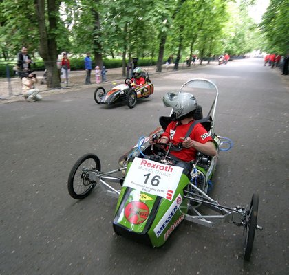 Korábbi tudósításainkból, amelyek elolvashatók itt és itt, már tudható, hogy a Pneumobil Versenyt Magyarországon, a Bosch Rexrothnál találták ki, és ők adják a nevezőknek azokat a pneumatikai részegységeket és alkatrészeket, amelyekből a légmotorokat meg lehet építeni. Pár mondatban a lényeg: a szervezők által megadott paramétereket figyelembe véve olyan léghajtású járművet alkotni, amely a versenypályán is megállja a helyét. Három kategória van: távolsági (leglább 2 km), gyorsasági (350 méter hosszú körök) és gyorsulási (220 méteres pályaszakasz). A verseny helyszíne Eger, azon egyszerű okból kifolyólag, hogy ott működik a cég magyarországi gyára, a Bosch Rexroth Pneumatika Kft. Az első versenyen 14 csapat indult, az idein már 33, köztük hét romániai team, erdélyi egyetemekről. A műszaki előírásokon egy lényeges ponton változtattak a szervezők: a munkahengerekbe áramló levegő nyomását nyolcról tíz barra emelték, ami előrevetítette, hogy új sebességrekord születik. Így is lett, a tavalyi 31 km/órás csúcs az idén 40 km/órára módosult.