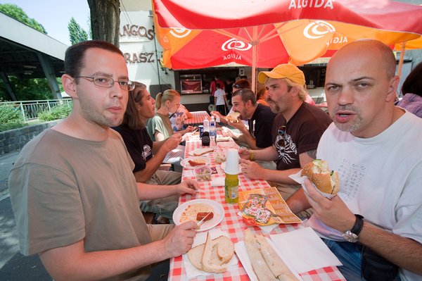 Persze voltak még egyéb programok is, nem hagyhattuk ki gyerekkorunk kedvenc agyzsibbasztóját, a szellemvasutat, aztán amíg engem Bősze Sándor bevitt a Hullámvasút belsejébe gyalog, s megnéztem a húszas évekbeli autószerelő műhelyek hangulatát idéző, a Körhintáénál csak alig kevésbé ódon, gépzsírszagú, hangosan zakatoló gépházba, Angéla, Vályi Pista és Zirig Árpi csónakázni indultak. Valamiért mind azt mondják, ez volt a vidámparki kirándulás legjobb része. Azt tudom, hogy Angéla nedves lett, azt is tudom, hogy Pista trubadúrt játszott, a céges kis gép tokja pedig tiszta víz volt, amikor kijöttek. Hogy mi történt ott bent? Gőzöm sincs, de nagyon vigyorogtak. Készült állítólag egy videó is, ha minden igaz, Tom rövidesen beilleszti ide. Én még nem láttam, legalább olyan kíváncsi vagyok rá, mint az olvasók.