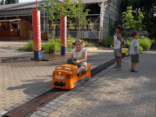 Aztán győzött a versenyszellem. Pistáék berángattak a gokartba, azaz ez az első gokart itt a Vidámparkban a Versenyautó nevet viseli a homlokán. Ugyanabból a szokásos, benzines, Honda-motoros vánszorgányból fut itt négy, ami minden ilyen gokartos helyen van manapság, csak ezekbe tettek övet is, meg akad rajtuk némi karosszéria. Itt a pálya a különbség a többihez képest, ami sima, mint az anyaméh, és gyönyörű nyolcasban megy magamaga fölé és alá. A lendületet ügyesen beosztva, ideális íveken autózva lehet itt előzni, de vigyázat, a testsúly sokat számít!