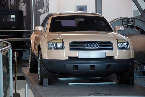 A Pininfarina Quartz jó társaságban van: több bizarr prototípussal együtt liftezik szüntelenül a csigatempóban mozgó óriás páternoszteren, amely a múzeum négy szintje között pörgeti a tanulmányautókat. Maga a szerkezet is remek, precíz mérnöki munka, lábszárnyi vastagságú láncon hordozza hangtalanul a tálcákat, amelyeken mintha az alagsori gépházból hozna fel egy-egy látomást. Például a Steppenwolfot. Mókás, hogy épp a Born to be wilddal világhírt szerző egyslágeres zenekar nevét vésték rá a kissé túlhizlalt TT-re. Németül persze prérifarkast jelent, de szerintem az ingolstadtiaknak is a Szelíd motorosok jut az eszébe a felirat láttán. Annyit érdemes azért tudni a közvetlen sorozatgyártású utód nélküli prototípusról, hogy ebben jelent meg 2000-ben a későbbi allroad állítható magasságú légrugós futóműve meg az elektrohidraulikus kézifék is. Lehet, hogy jobb lett volna, ha az utóbbi megmarad exkluzív Steppenwolf-felszereltségnek.