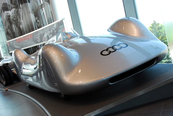 Ha már szóba kerültek az ezüstnyilak, nem mehetünk el a múzeum egyik legtarkább történetű autója mellett. Az 1938-as Auto Union Typ C/D nem csak a V16-os, kompresszoros motorja miatt különleges. Abból a korszakból származik, amikor az a bizonyos Bernd Rosemeyer, akiről a 2000-es tanulmányautót elnevezték, még javában versenyzett. Az 520 lóerősnek mondott Typ C és Typ D versenyautók a második világháború előtti nagy Mercedes-Auto Union versengés főszereplői, sebességrekord-kísérleteknél 400 km/h feletti sebességeket értek el, 160-nál még erőből elforgatták a hátsó kereket, mindezt egy Zsiguli szintű futóművel és egy kretén buszkormánnyal.