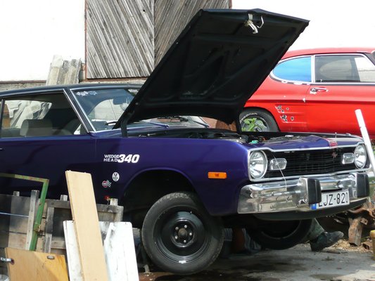 A kék Ezeröcsit még Ricsi haverjának apukája hozta ki a Merkurból, és bár néhány helyen kicsit ragyás, nem fényeztetik le: ez még az eredeti festék. Vezettem, mondja Kölyök, úgy éreztem magam, mint Ötvös Csöpi. Az egytulajdonosos Zsigulit pedig viszik esküvőkre, forgatásokra. Őt követi egy 1970-es Chrysler Newport, ez is egy ördögmotor, egy 383-as (6,3 liter), és Ricsi még mondana róla néhány dolgot, de ekkor észreveszem az épület mögül elővillanó lila orrot, márpedig ilyesmivel sajnos nekem nagyon könnyű elvonni a figyelmemet. A 70-es Dodge Dart, illetve az 5. generáció nekem nagyon régóta tetszik, és ilyet se láttam még élőben. Erős izgalmi állapotban totyogok az autó felé, de nincs sértődés, mert ez véletlenül pont a Kölyöké. 1972-es, most épp szedik szét a váltóját a srácok, mert a hét végén ezzel kell majd Komáromba menni. Az eredeti lemezfelnikkel – istenem, mennyire szeretnék egyszer egy ilyen, illetve szinte bármilyen, lemezfelnis proli izomautót!