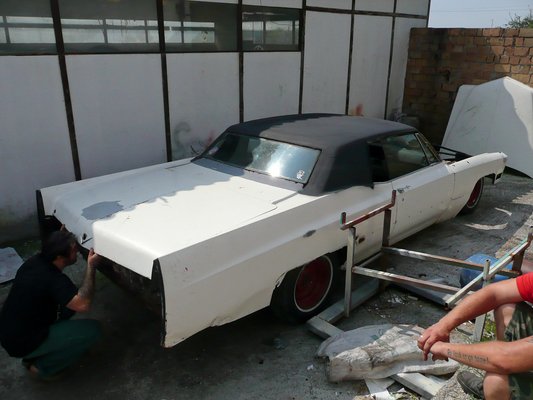 A fehér Cadillac a Báró legkomolyabb projektje, eddig csak a hátuljából szedtek ki 300 kilót. Mármint könnyítettek, de nem tudok érdemben hozzászólni, vagy elájulni, hiszen ami nincs, azt nem látom. És amit most nem látok, azt majd alumíniumból pótolják, de mivel ugye látnok nem vagyok, így azt sem látom.