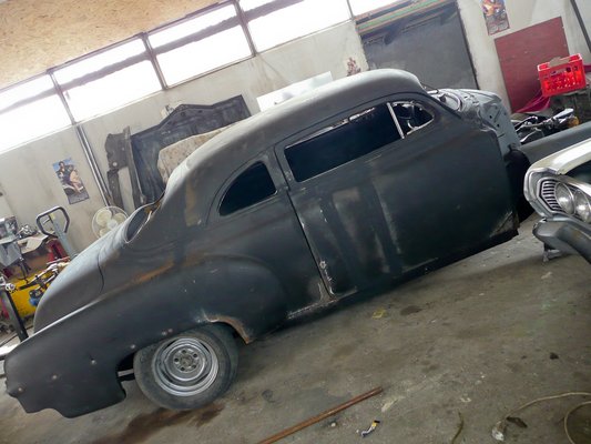 Az 1950-es Pontiac már elég komoly átalakítási munka. 23 centivel hozták hátrébb a középső tetőoszlopot. Igazán szép lakatolás – már így, fényezés nélkül is nagyon együtt van a forma, kifejezetten keresgélni kell a hegesztéseket. Felmerül persze a kérdés, hogy ha ilyen Pontiac Streamlinerből volt kétajtós is, miért nem annak csoppolták a tetejét, de gondolom, ilyen autó volt kéznél, Ricsi meg hamarabb összelemezeli ezt, mint hogy szereznének egy másik Pontiacot Amerikából. A tetővágás nagyjából 13 centi. A hátsó szélvédő keretét úgy faragták, hogy csak laposabb legyen, de az üvegből ne kelljen vágni, mert ehhez nem olyan egyszerű már szélvédőt rendelgetni. Már így is elég jól néz ki, de nehéz eset a megrendelő, úgyhogy rendes fényezés lesz. És persze behúzómágneses zár, kilincs nélkül. Elég nehéz lehet kilátni, jegyzem meg, de egy tetővágónak ilyet természetesen nem szabad mondani.