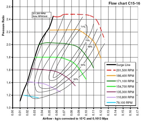 Nézzük a további alternatívákat az Almera feltöltésére. Műszakilag a legegyszerűbb megoldás a Rotrex cég által gyártott feltöltő, amely nem más, mint egy centrifugálkompresszor, mechanikus hajtással. Vagyis a kompresszor ugyanolyan, mint a klasszikus turbóban, viszont nem kipufogógáz-turbina pörgeti, hanem ékszíj hajtja. Persze ahhoz, hogy érdemben levegőt szállítson, ahhoz egy gyorsító áttételre is szükség van, erre egy bolygóművet építettek be a hengeres házba, amely nagyjából 12-szeres áttételt hoz létre. Persze, lehet játszani még lehet az ékszíjtárcsával, hisz a legkisebb modell névleges fordulatszáma 200 000/perc, és ezzel az áttétellel te valahol 70 000 táján jársz maximum. A motor illesztési görbéjét akarnád megszerkeszteni, íme a szállítási jellegmező.