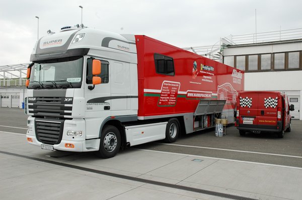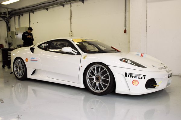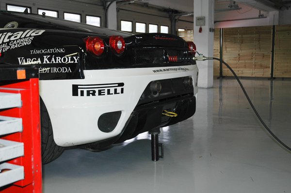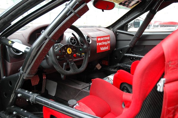 Később kérdezősködtem a szerelőktől is az F430 Challenge-ről – azt mondják, viszonylag egyszerűen állítható, szerelhető autó. Nagyrészt megegyezik a szériakocsival, csak a futómű, a difi, a kipufogórendszer és a versenyzés kellékei, a bukókeret, a tűzoltó készülék, a kagylóülések, a beépített pneumatikus emelő, a digitális információs kijelző és még néhány apróság különbözik. A motor teljesen gyári – plombálva érkezett Maranellóból, így nem lehet belepiszkálni –, ahogy a szekvenciális váltó is.