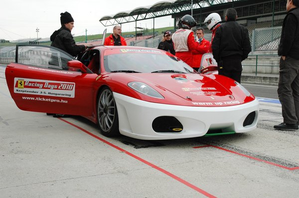 Itt egy pillanatra meginogtam. Ismeretlen és villámgyors versenyautó alig ismerős pályán – még egy Kispolszki is ijesztő lenne ilyen körülmények között, ez meg egy 490 lovas, versenyzésre használt Ferrari. Ráadásul akadt még egy akadály: vezetni csak erre való cipőben engedtek, viszont ebből 43-as volt a legnagyobb, ami épp két számmal kisebb a szükségesnél. Itt azonban már nem futamodhattam meg: felhúztam a csukát – járni persze alig tudtam benne, de pedált nyomkodni talán jó lesz – és elindultam az autó felé. Tibor beleegyezett, hogy eljön velem, és egy kicsit instruál menet közben. A beszállás már flottul ment az előzőhöz képest, felkerült a versenyzőkesztyű is – itt már nem volt visszaút, menni kellett.