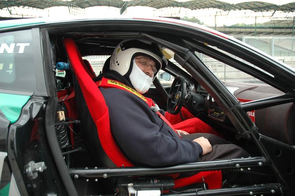 Pilótánk néhány perccel később kivitte a fekete-fehér gépet a pályára, hogy egy kicsit bemelegítse a gumikat – öt perc, és én következem. Került maszk és bukósisak –, itt már kezdett remegni a térdem az izgalomtól. Aztán befutott a felmelegített Ferrari. A beülés a jobb oldalra igazi tortúrának bizonyult. Egyrészt sem az ajtót, sem az ülést nem az én termetemhez találták ki, másrészt túl hamar bevágódtam, így nem hagytam időt a szíjak meglazítására – vagy 10 percen át szenvedtünk két szerelővel, mire szabályosan bekötöttek. Aztán ránk csukták az ajtót, és jöhetett az első menet.