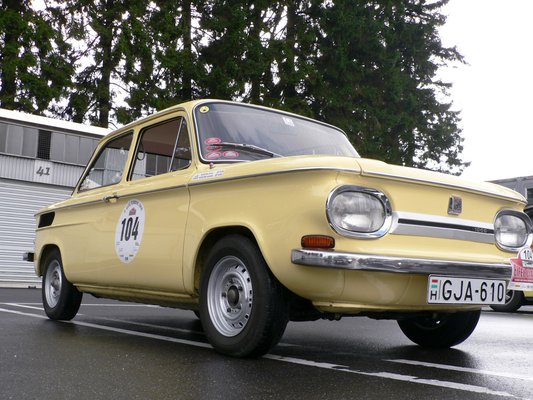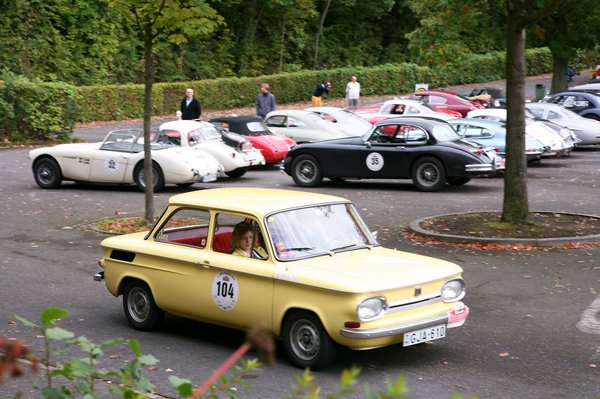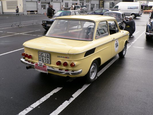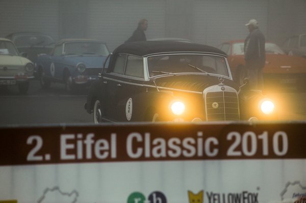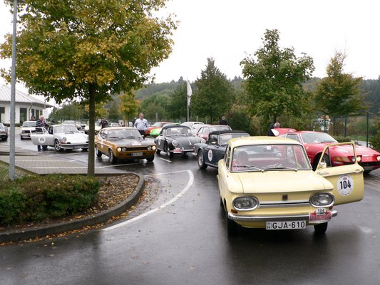 Csütörtök reggel. Eifel Wetter, vagyis eső, köd, hideg. A kocsiig megtett pár méter alatt szivacsként nyeli el ruhánk és cipőnk a vizet. Az üvegek rögtön bepárásodnak, le kell kurblizni az ablakokat, hogy valahogy kilássunk. A körülbelül öt kilométeres úton Nusi 70 lóereje magára talál. A helyszűke miatt – mondjuk úgy – kaotikus, de felügyelt állapotok uralkodnak a rajt környékén. Az állam a sok látnivalótól a földet söpri. 160 sportkocsi és versenyautó, Porschék, Jaguarok, Mercedesek, Ferrarik, Opelek, Audik, BMW-k, brit roadsterek, VW-k mindenfelé, van három NSU is!