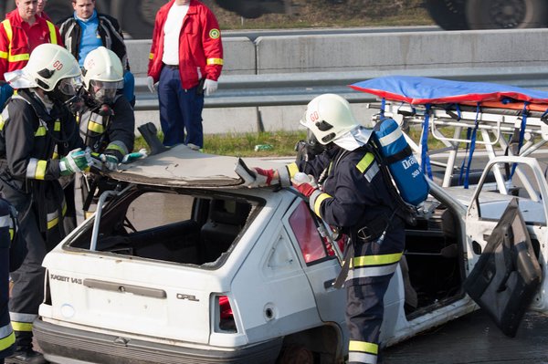 A mentés következő fázisa a holttest és a sérült kiemelése. Előbbit az út szélén letakarták, utóbbit ráemelték a hordágyra és elvitték a mentőautóhoz. A sérültnek a mentőben stabilizálják az állapotát, majd kórházba szállítják. Ekkor tudatosult bennem, hogy nem bábuk, hanem valódi tűzoltók gubbasztottak a roncsban. Eddig a mese. A gyakorlat során ugyanis egy tűzoltó valóban megsérült, ha jól hallottam, vágási sérülést szenvedett – őt a mentőhelikopter szállította el, reméljük, nincs komoly baj.