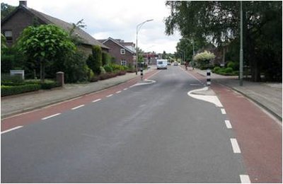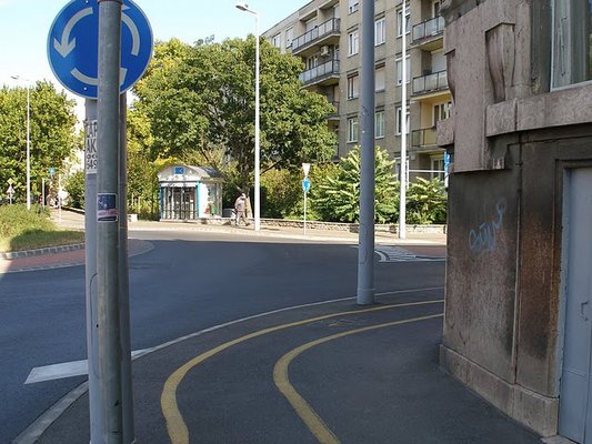 Vagy nézzünk egy körforgalmat kerékpárúttal, van sok ilyen az országban: a kerékpárosokat a gyalogosokkal együtt vezeti körbe egy erre kijelölt kerékpárút, ezzel elérve azt, hogy – ha a kerékpár vezetője szabályosan közlekedik – megsokszorozza a konfliktuspontok számát, ahelyett, hogy az úttesten megfelelő sáv kijelölésével a közös haladást biztosítanák.