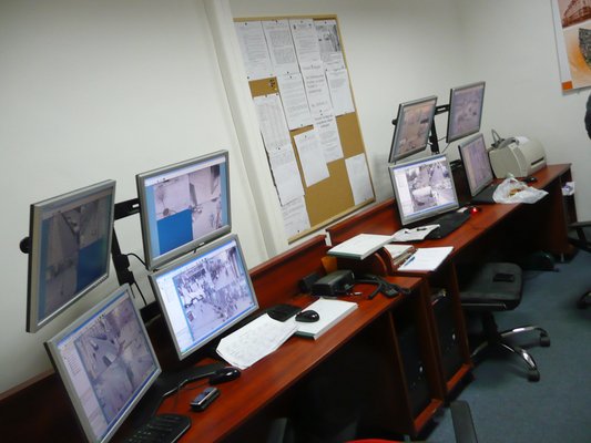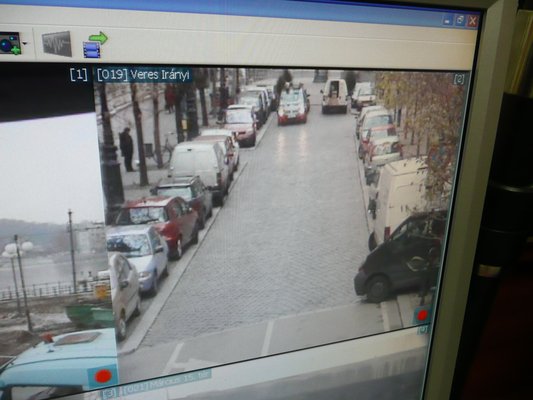 Az 5. kerületi önkormányzatnál szerfölött konstruktívak: két rövid telefon, és már ott is vagyok a Dorottya utcában, egy-egy portányira a különböző dizájnerboltoktól, de azért hamisítatlanul kincstári kapubejárónál. Itt, a 9-ben dolgozik a kerületi közterület-felügyelet, innen járnak ki a felügyelők és itt van a két kameraszoba. Egy a térfigyelő kamerákhoz, egy a süllyedő oszlopos beengedő rendszerhez. A legendás, első emeleti kameraszobában kétszer négy monitor előtt kétszer egy rendőr, illetve kétszer kettő, napi 12 órás műszakokban, hatórás váltásokkal. A fejenként négy monitor további részekre osztható, darabján általában négy kamera képe fut, így az összesen 40 kerületi kamera képe elég gyorsan sorra kerül.