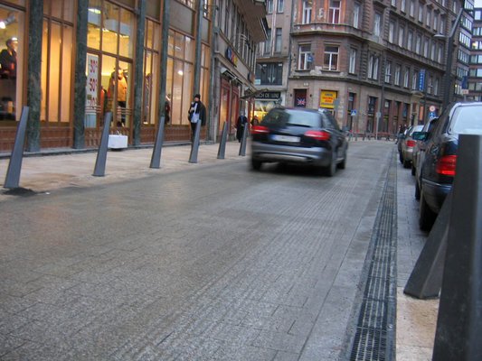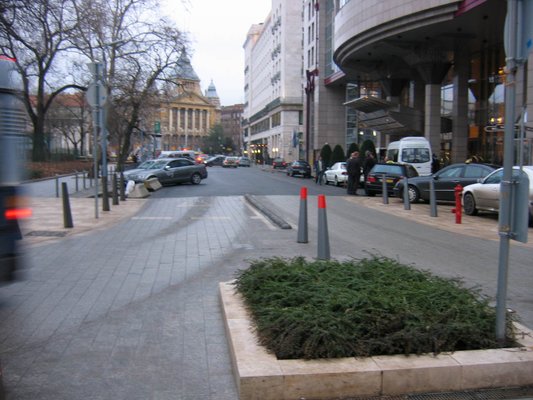Ha élelmesek vagyunk, nem megyünk el a Károly körútig, hanem a forgalmat nagyban feltartva nekiállunk ipszilonozni a Kempinski előtt, és megkerüljük a süllyedő oszlopot. Ugyanis a süllyedő oszlop csak úgy 1 méternyi szakaszon zárja el a Bécsi utcát, mögötte folyamatosan halad a forgalom, hiszen a Kempinski előtt érkező autóknak el kell jutniuk a József Attila utcáig, mivel a Károly körútról nem lehet balra, a Lánchíd felé kanyarodni, ez az egyetlen út visz a hídra, Budára.