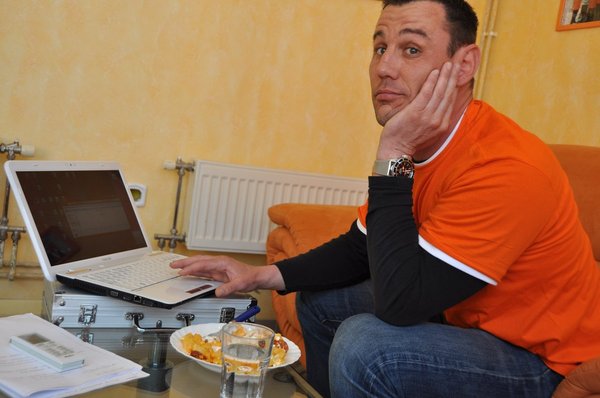 Nézegetjük a kedvenc hirdetéseit, mármint a saját kedvenceit, mert előzőleg megkértem, szedje össze őket. Közben meglátok az udvaron egy embert, aki mintha egy kurucinfós fantomképről lépett volna le, és felteszek valami provokatív kérdést, már nem is emlékszem, mit.
