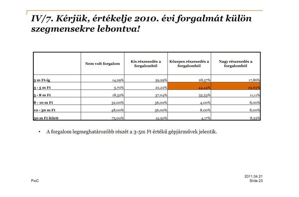 A Pricewaterhouse Coopers egy tanácsadó cég, idén harmadszorra végezte el felmérését az autókereskedőknél. Az általános sírás-rívás hangulata mintha átment volna várakozásba: a döntő többség úgy látja, kivárja a fellendülést. Az indok egyszerű: aki erre nem képes, annak többnyire bedőlt tavalyig a vállalkozása. A maradék viszont kitartónak tűnik.