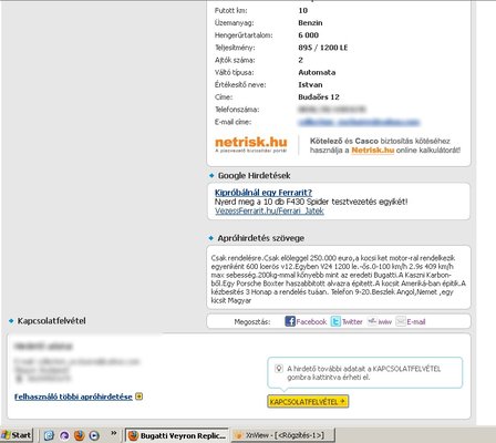 Csak rendelésre.Csak elöleggel 250.000 euro,a kocsi ket motor-ral rendelkezik egyenként 600 loerös v12.Egyben V24 1200 le.-ős.0-100 km/h 2.9s 409 km/h max sebesség.200kg-mmal kőnyebb mint az eredeti Bugatti.A Kaszni Karbon-ből.Egy Porsche Boxter haszabbitott alvazra épitett.A kocsit Ameriká-ban épitik.A kézbesités 3 Honap a rendelés tuáan. Telefon 9-20.Beszlek Angol,Nemet ,egy kicsit Magyar