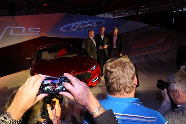 Annyiban alábecsültem a Fordot, hogy egy átkozott színváltós fényezéssel is megfejelte a dolgot. Ja, és még egy remek ötlet: eddig az újságírók a prezentációkat lefotózták, a töksötétben jegyzetelni amúgy sem lehet, mert mindig elfelejtek bányászlámpát vinni. Na, most egy közel vízszintesig döntött felületre vetítettek.