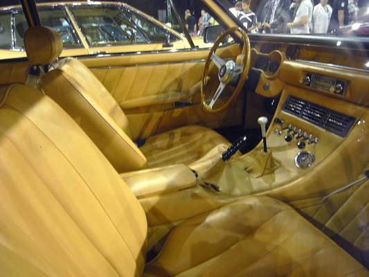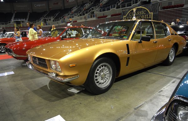 De mi ez itt? Látják, ez az a kocsi, amiről nem hittem volna, hogy az életben látok ilyet. Iso Fidia, egy végtelenül kicsi, rövid életű olasz sportautógyár (Iso Grifo, rémlik?) Maserati Quattroportéja. 1969-ben készült, a motorja 5,3-as Chevy small-block, itt 350 lóerővel. A 230-as végsebességnél sokkal lenyűgözőbb egy másik számadat: 104 darabot gyártottak belőle összesen. Hát ezért hittem, hogy csupán autós könyvek lapjain létezik. De nem, akinek elég hosszú a keze, meg is tapogathatta a nóziját.