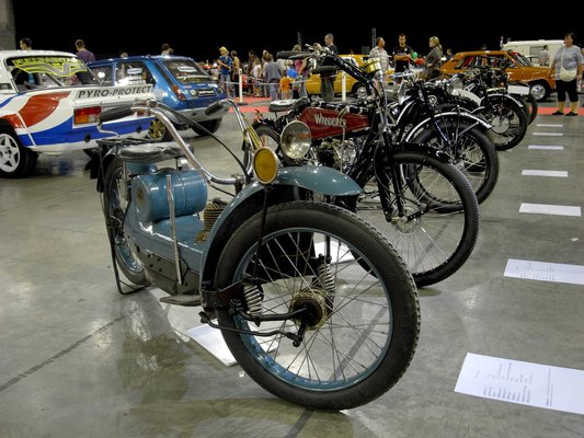 Motorokból is volt egy szerény, ám annál érdekesebb felhozatal. Ilyen közelről még sose láttam Ner-a-Car nevű szörnyet, amit a húszas évek Amerikájában kétkerekű autónak hirdettek. A robogó egyfajta ősét tisztelhetjük benne, motorja 350 köbcentis, 15 lóerős, kétütemű. És nézzék azt a szörnyű első futóművet! Vicces...