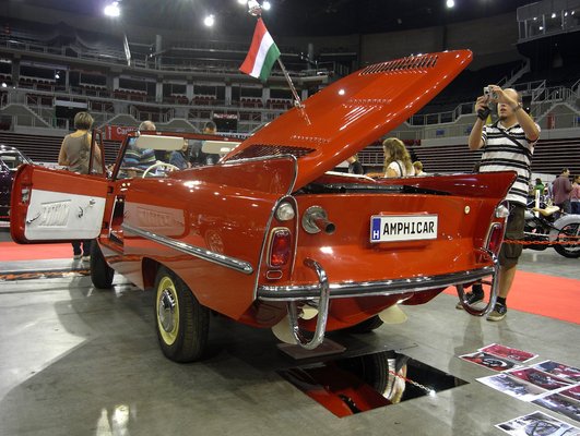 És egy autó, amire (vagy egy ilyenre) lehetőségünk is van, hogy teszteljük, remélem előbb-utóbb tudjuk is: Amphi Ranger, a Triumph-motoros kétéltű jármű. Persze nem repülni tud, hanem vízen járni. Az aszfalt a másik terepe.